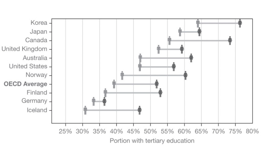 This doesn’t seem to be cherry-picked data at all, and lines up with most of what I know about educational outcomes - see below for a figure, also taken from the book, that shows that a higher proportion of girls go to university than boys across the OECD. The evidence comes thick and fast, and is convincing: boys are really doing pretty badly at school, getting into university at lower rates, and performance isn’t improving much.